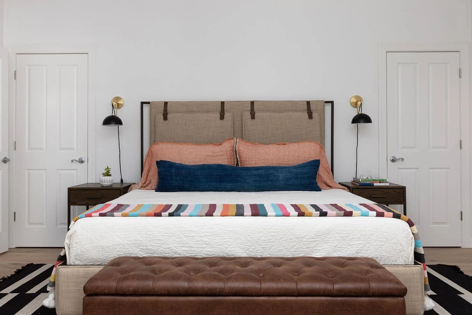 The primary bedroom offers an inviting splash of color and texture. A comfortable area rug, matching bedside tables, and bold linens combine for a relaxing and personalized retreat.